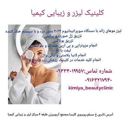 آدرس: نادری - خیابان مسلم - روبروی کلیسا - مجتمع آریوبرزن - طبقه 4 - مرکز لیزر و زیبایی کیمیا